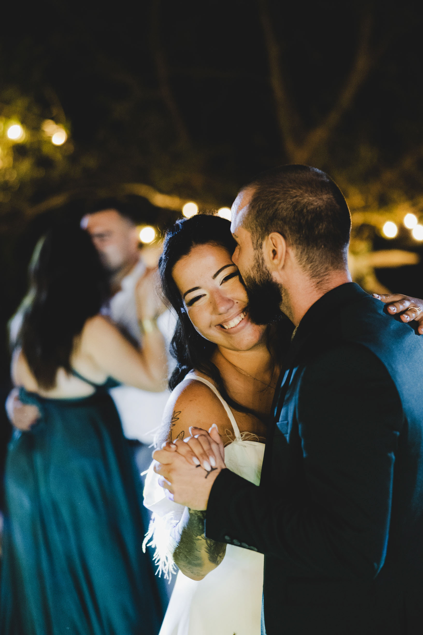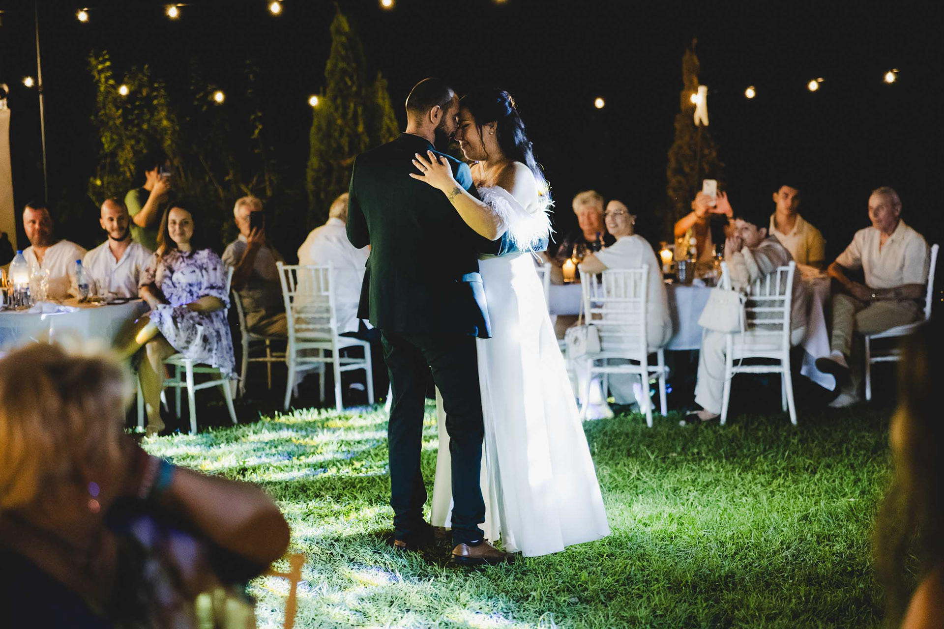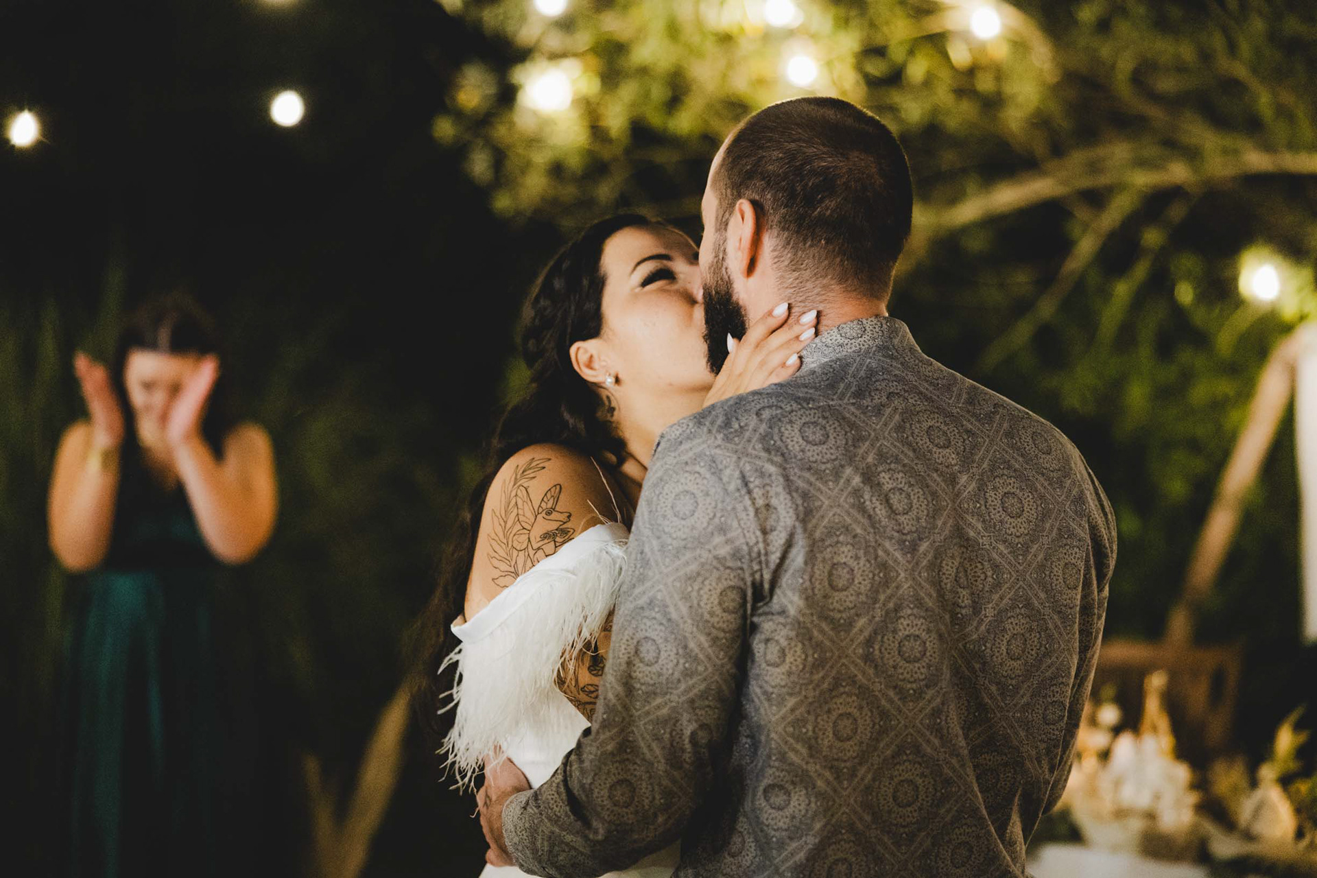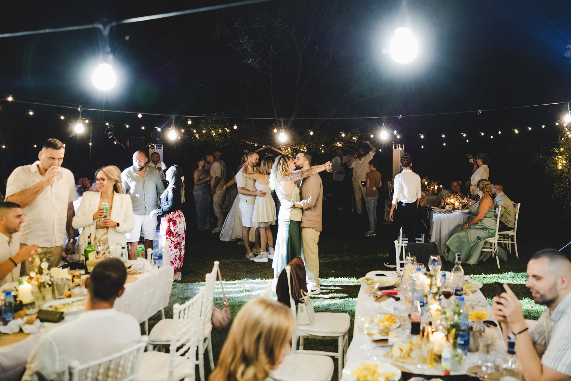 Емоционална сватбена целувка под светлините на гостите в хотел Света Анастасия, Бургас.