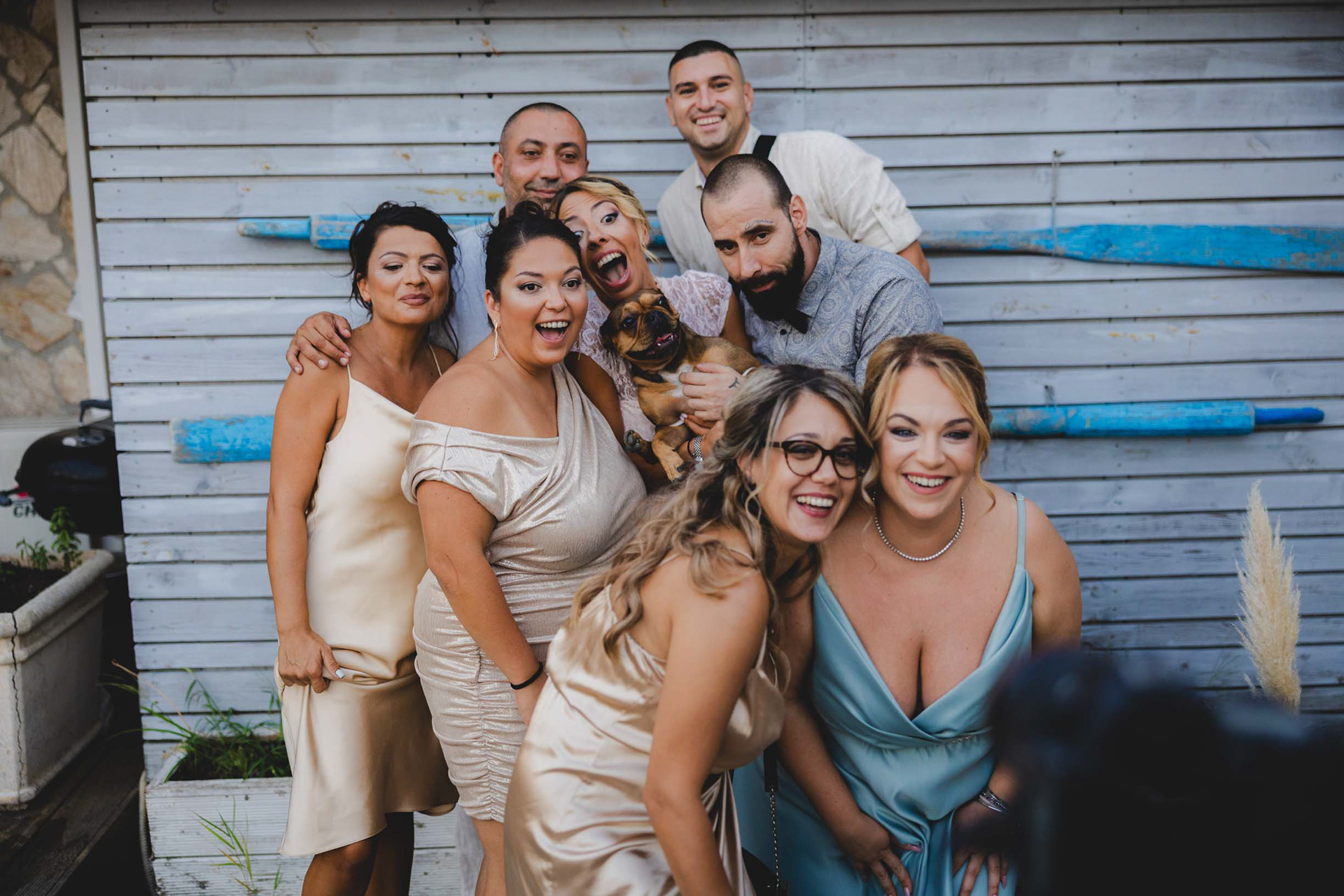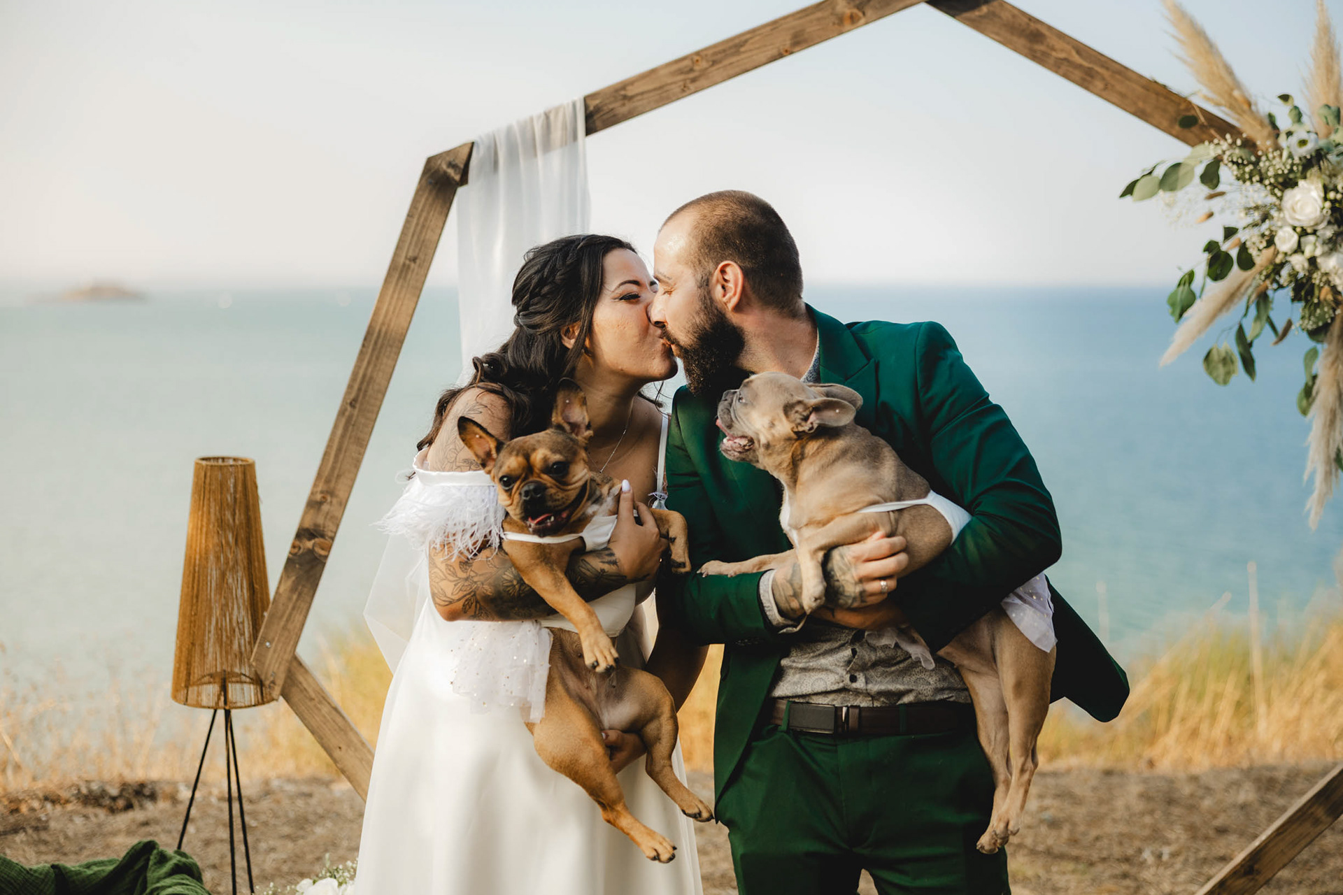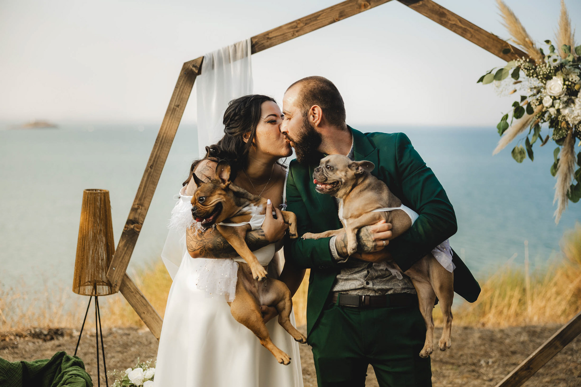 Цялото семейство в един кадър! Целувка с домашните любимци пред сватбената арка в парк Росенец, на фона на морето и остров Света Анастасия.