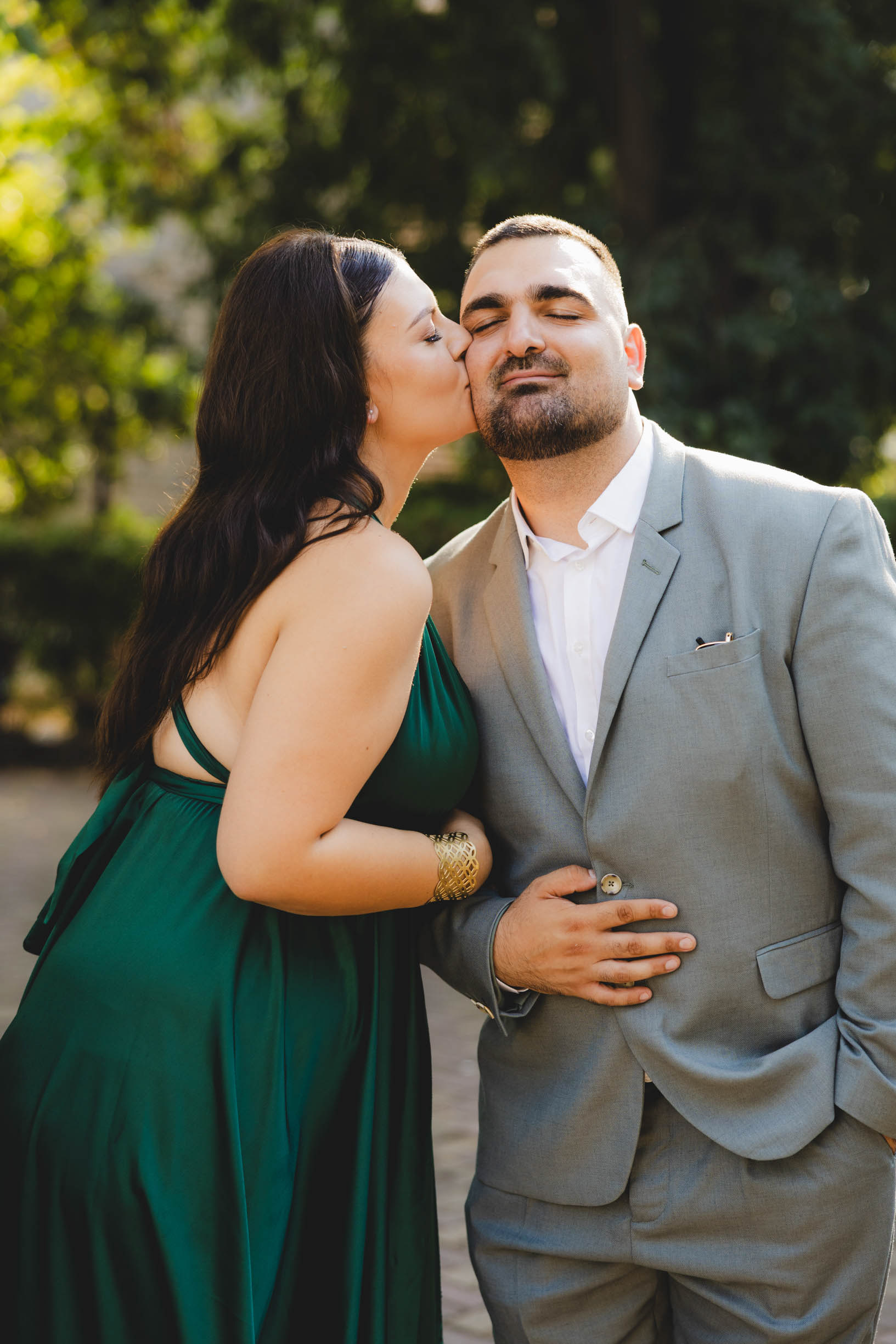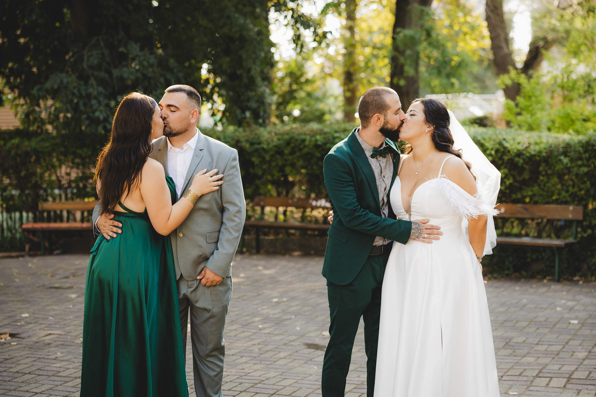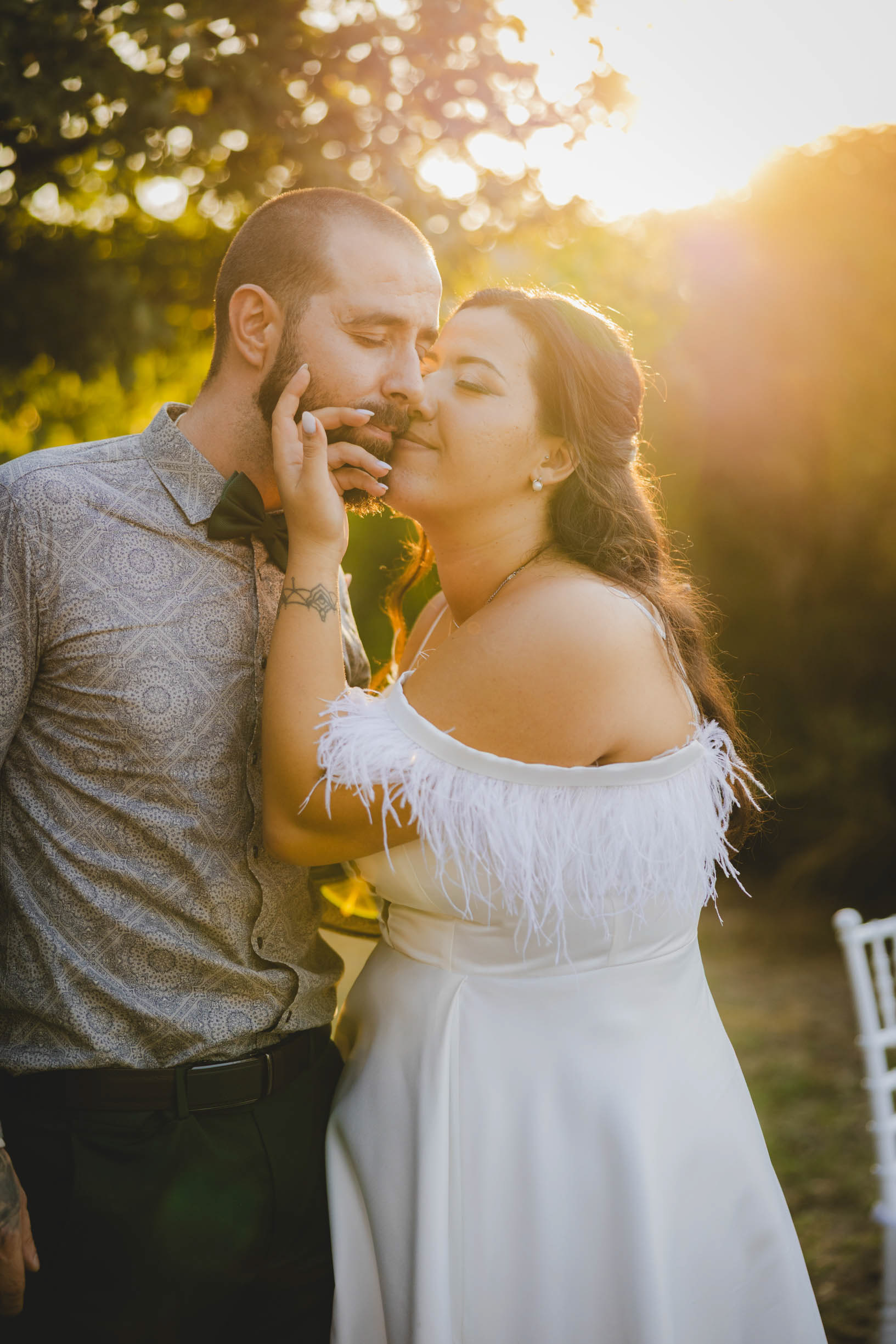 Целувка между младоженци в контражур, заснета от сватбен фотограф в парк Росенец