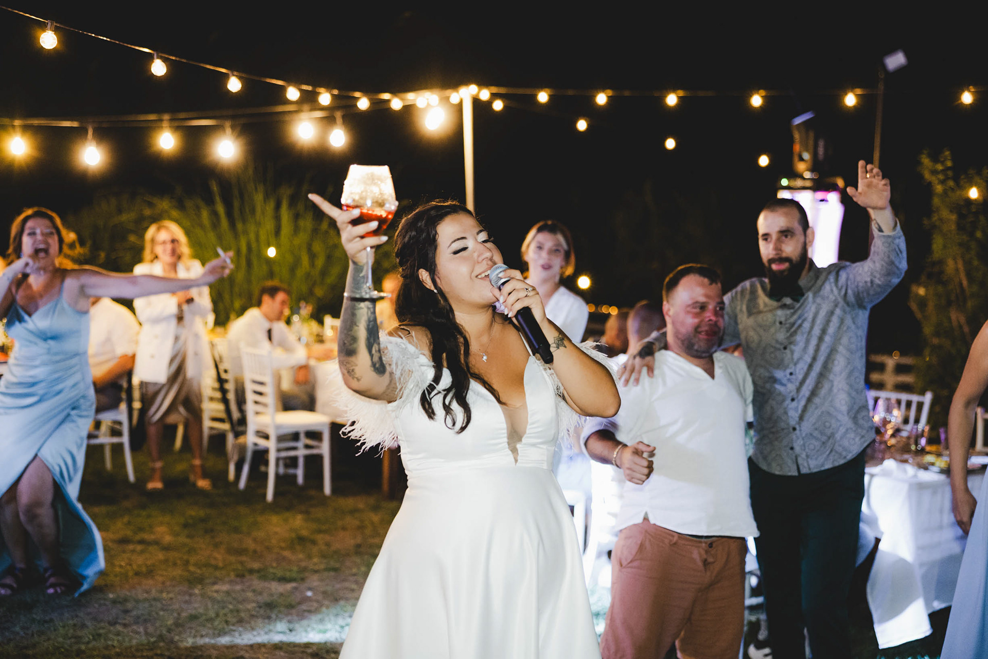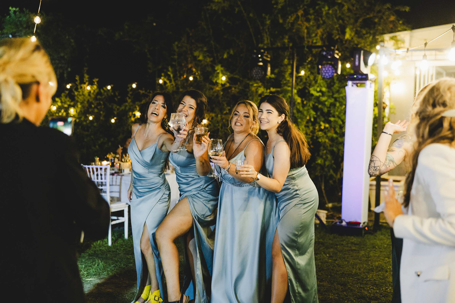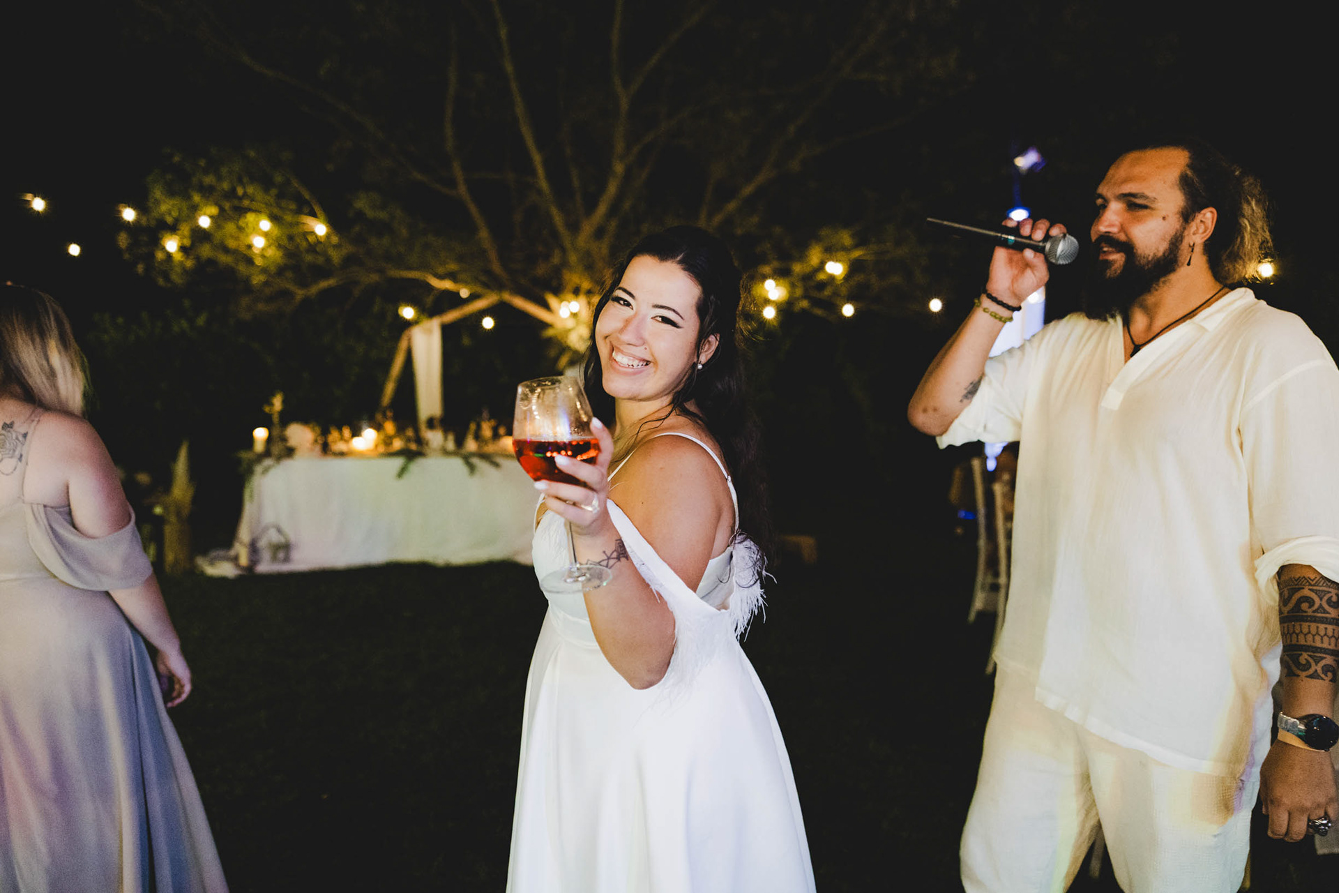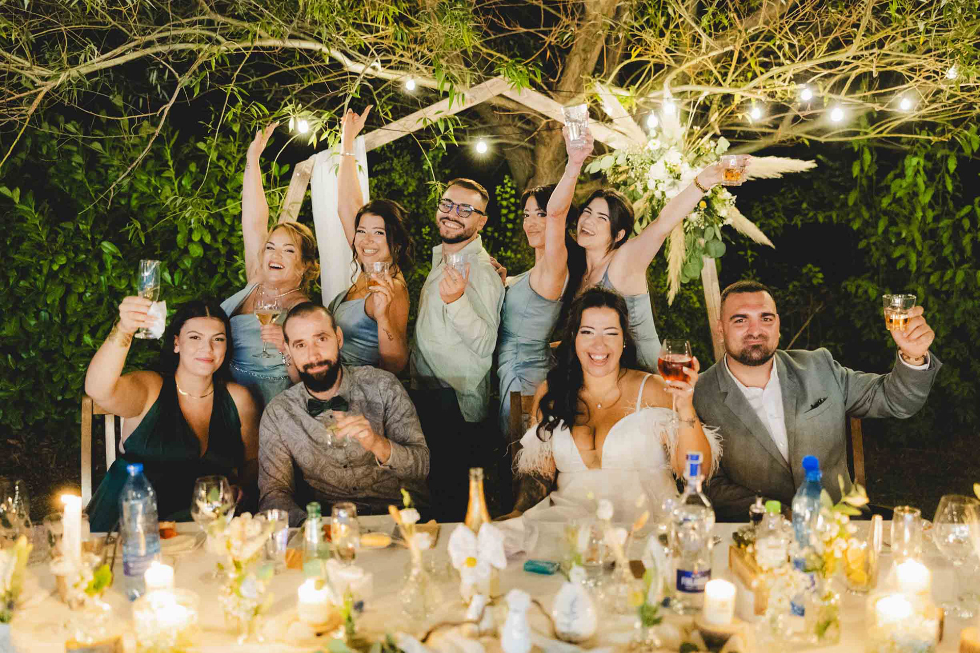 Първото "наздраве" от младоженците. Нощна сватбена фотография с естествена светлина