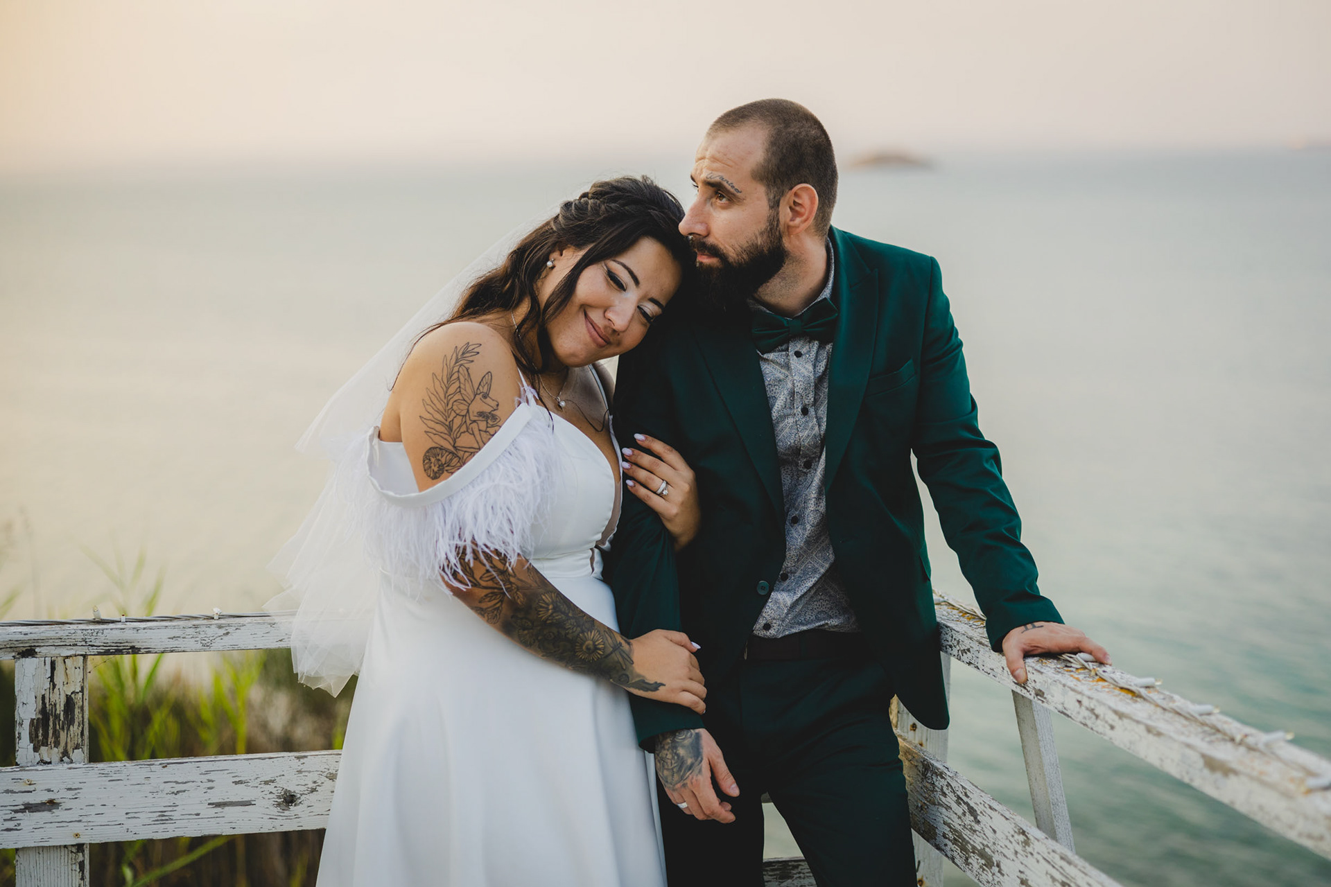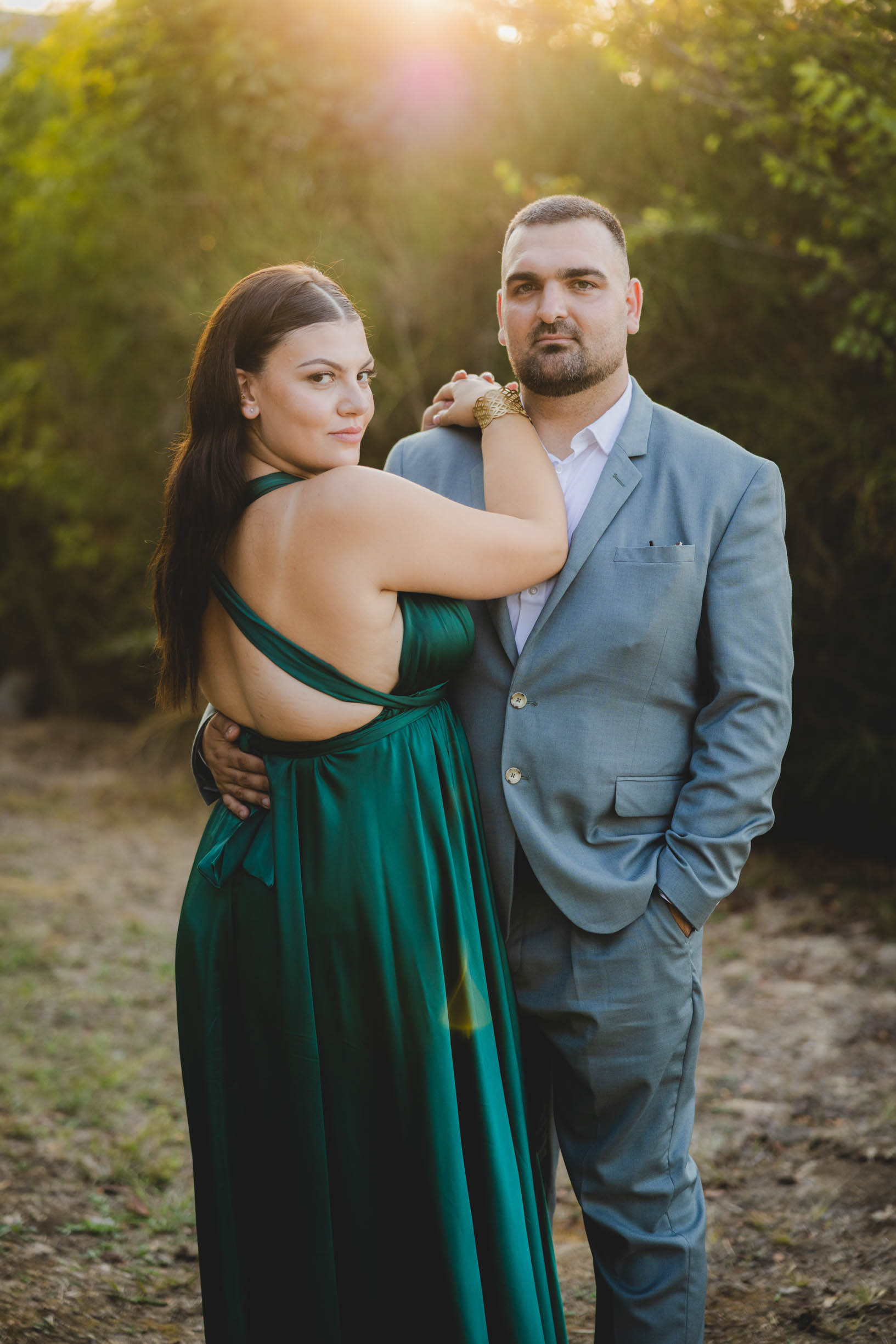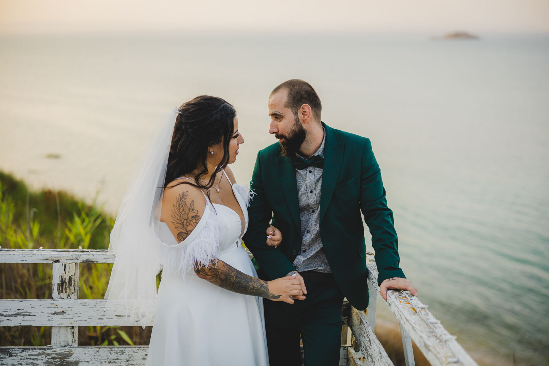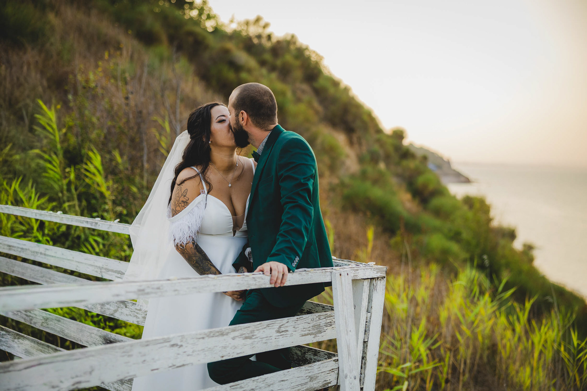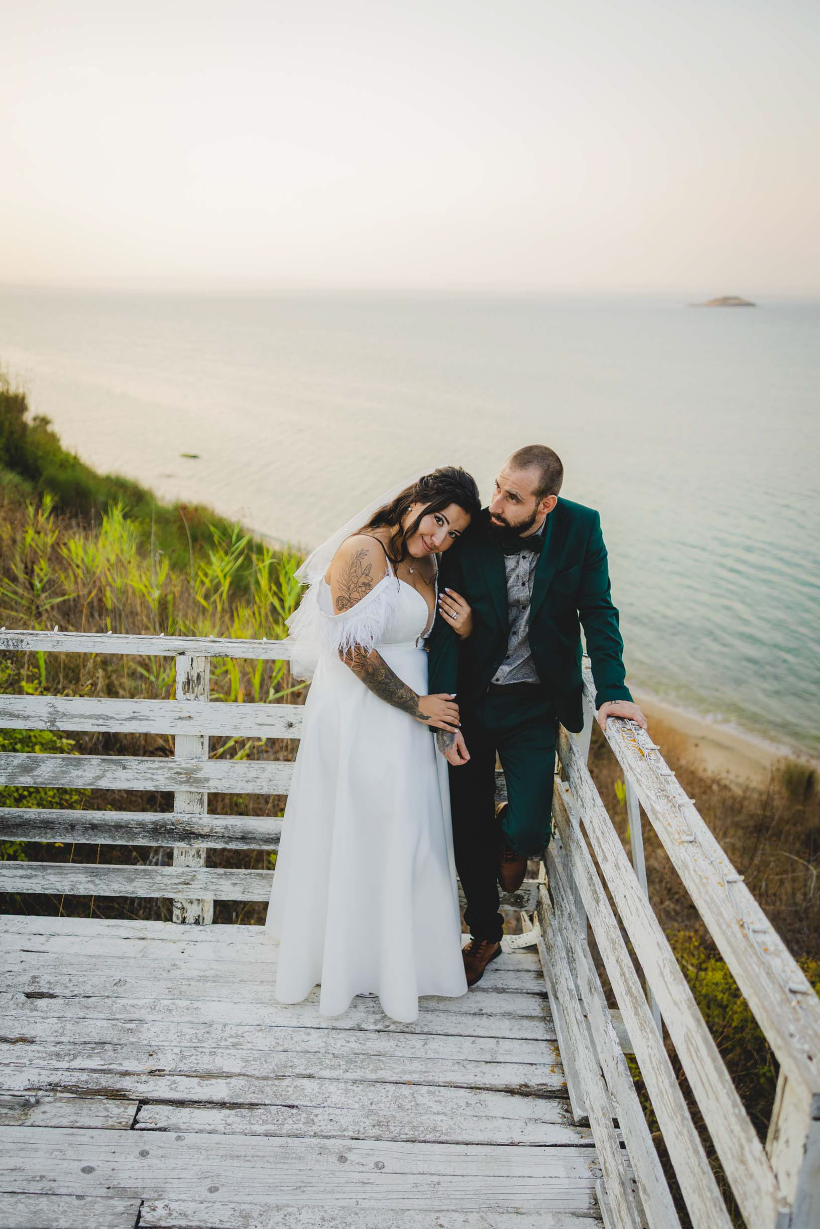 Парк Росенец предлага уникална комбинация от горска прохлада и морски бриз. Снимахме сред високите борове, където светлината падаше меко през клоните, а после слязохме по стръмната дървена пътечка до скалите за онези епични сватбени кадри с морето. А на заден фон - островът Св Анастасия. Това е магията на сватбата в Отманли - получавате две коренно различни атмосфери в една фотосесия.