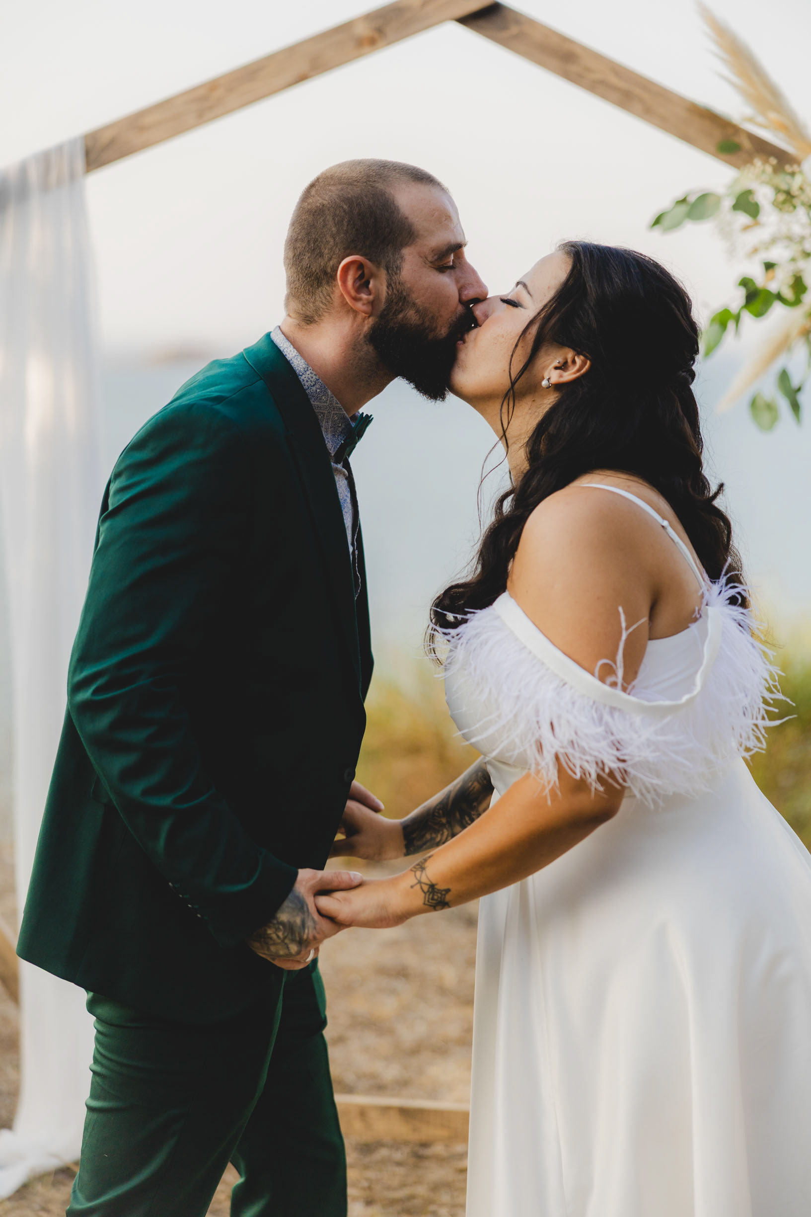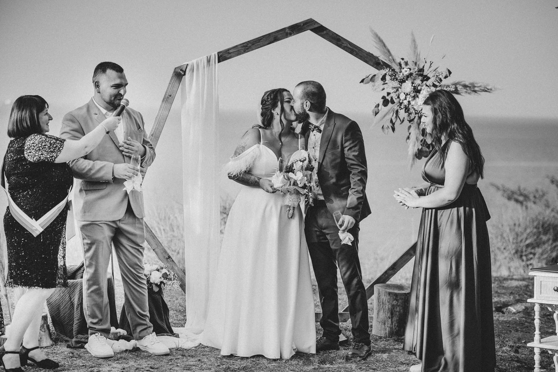 Анна-Мария и Росен споделяха моята страст към естествените материали и дървените декорации. Още докато обсъждахме детайлите за сватбения ден, те бяха категорични: „Габо, искаме за ритуала да ползваме твоята дървена сватбена арка." Като сватбен фотограф и създател на арката, за мен беше истинско удоволствие да видя как това ръчно изработено мое творение се превърна в център на тяхното „Да“ под открито небе в Бургас.