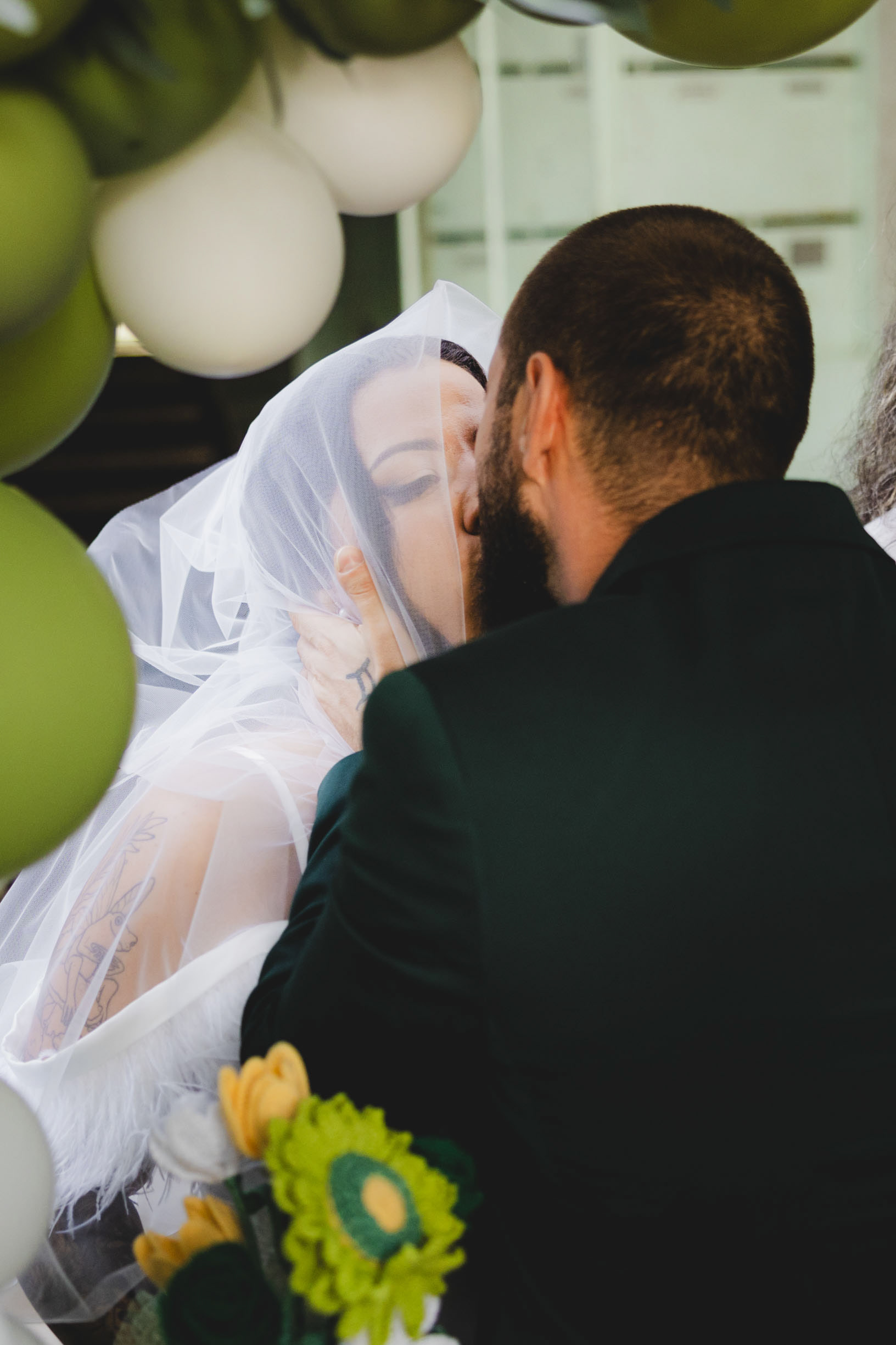Кумата е влюбено целува кума - артистична сватбена фотография с фон на сърца