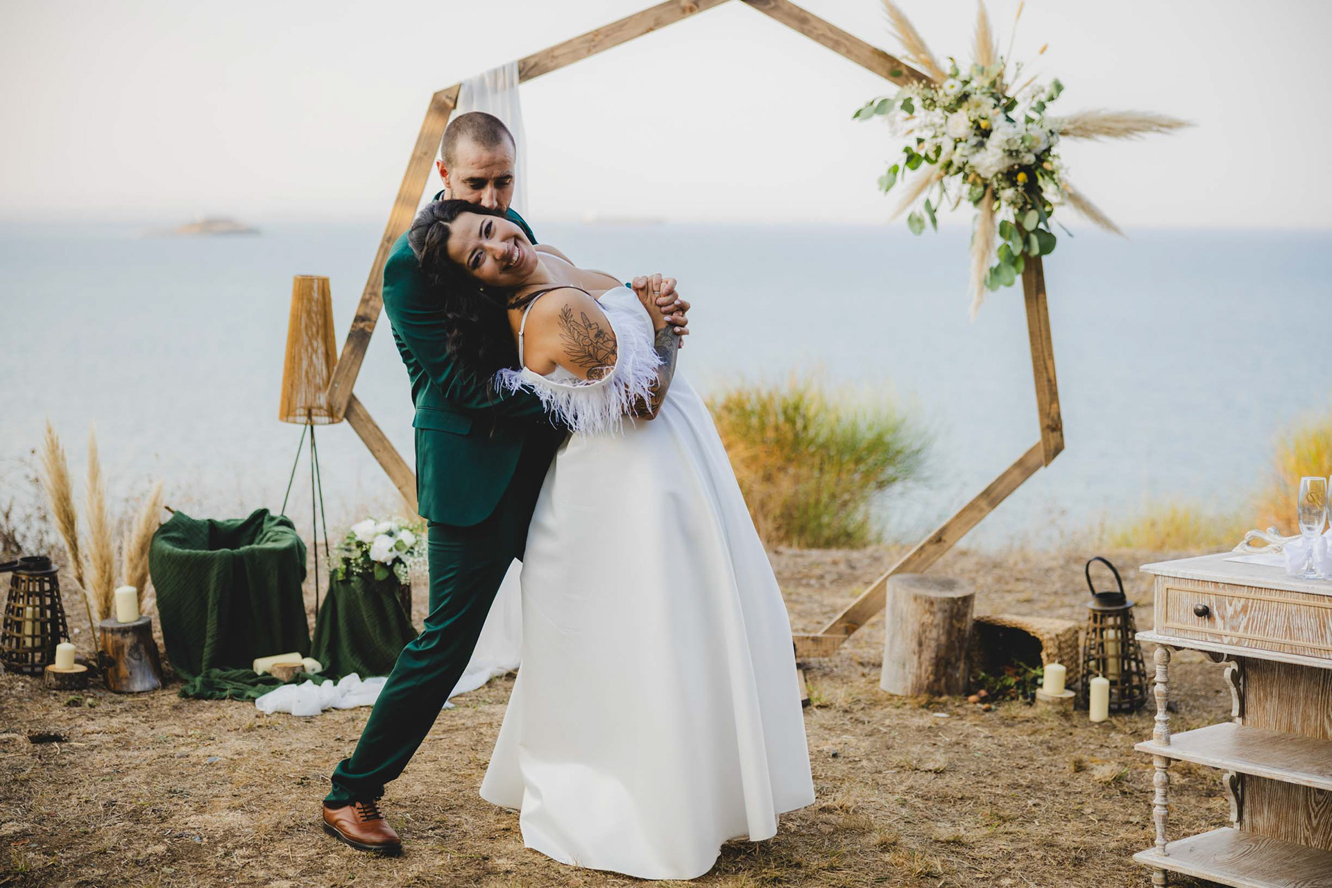 Първи брачен танц пред бохо седмоъгълна сватбена арка.