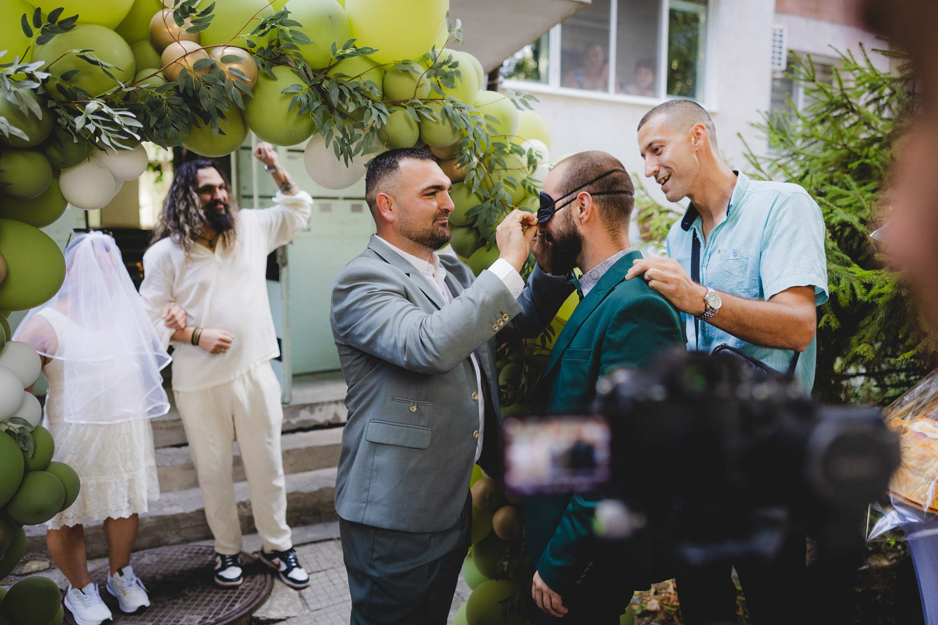 Кумове се наслаждават на сватбената фотосесия - сватбен кадър в Отманли