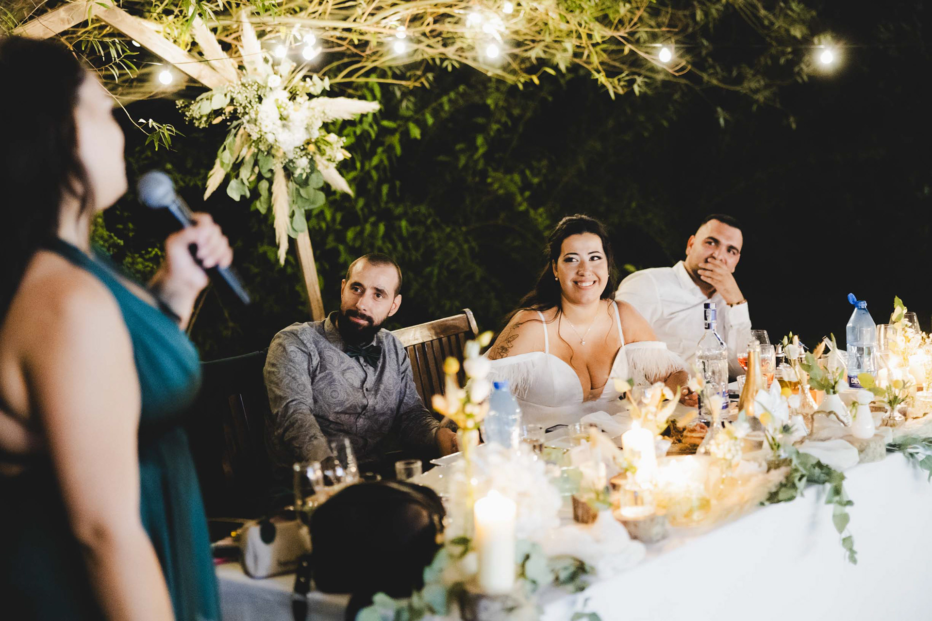Младоженска маса с дървена сватбена арка в бохо стил - Сватбена фотография