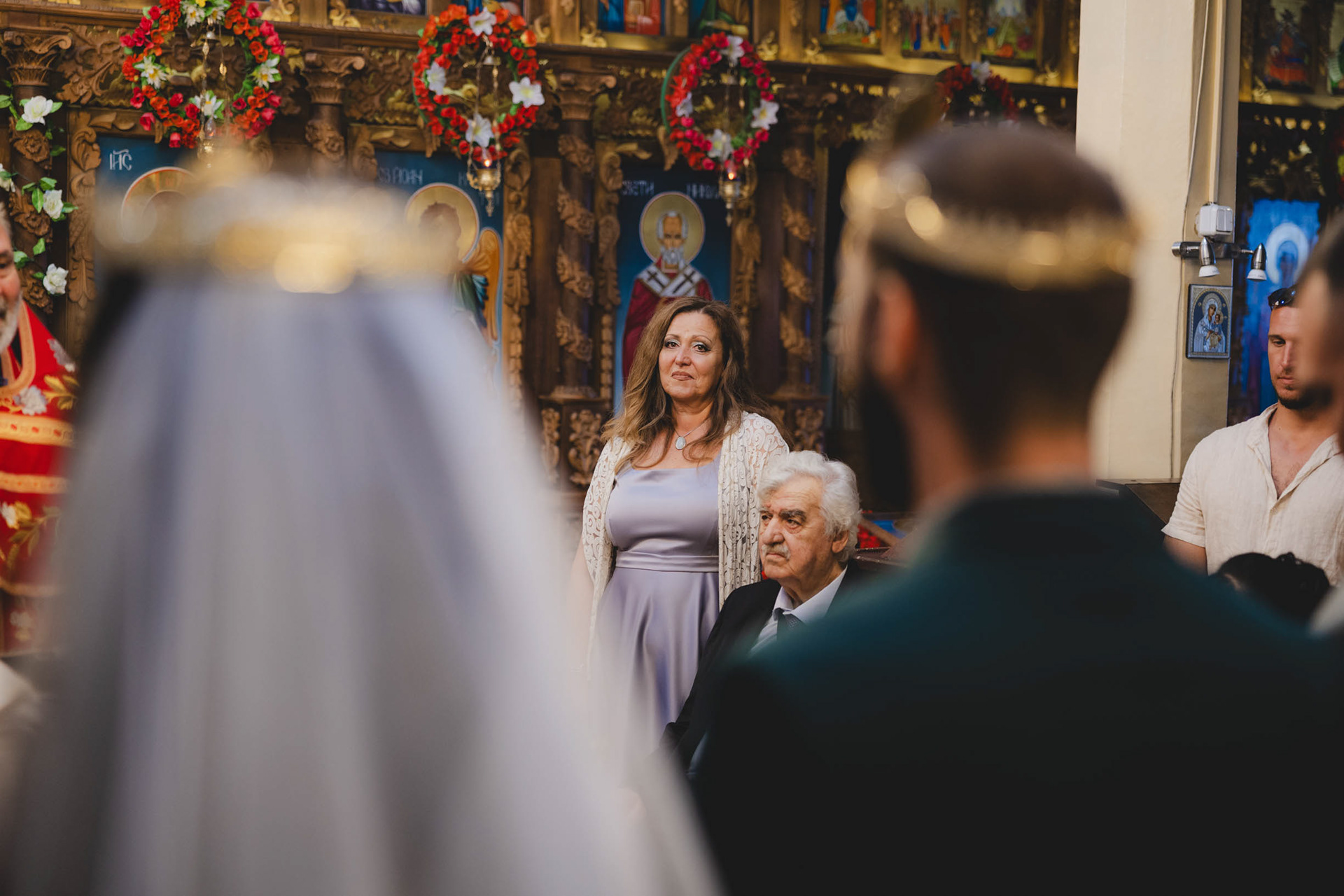 Родители с емоционален поглед към младоженци по време на църковен ритуал