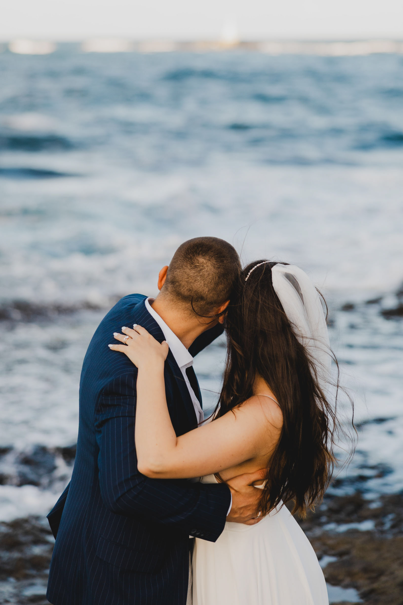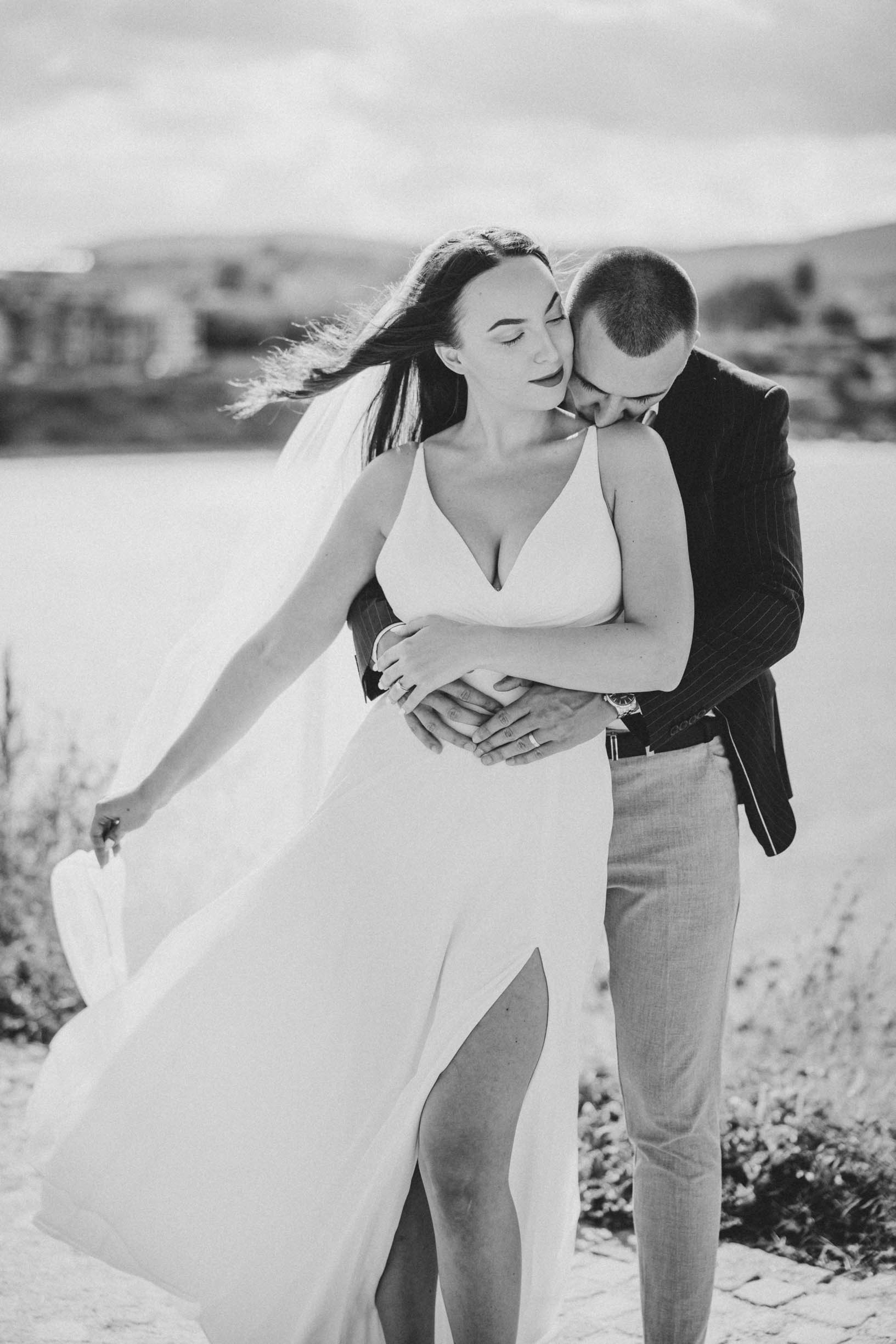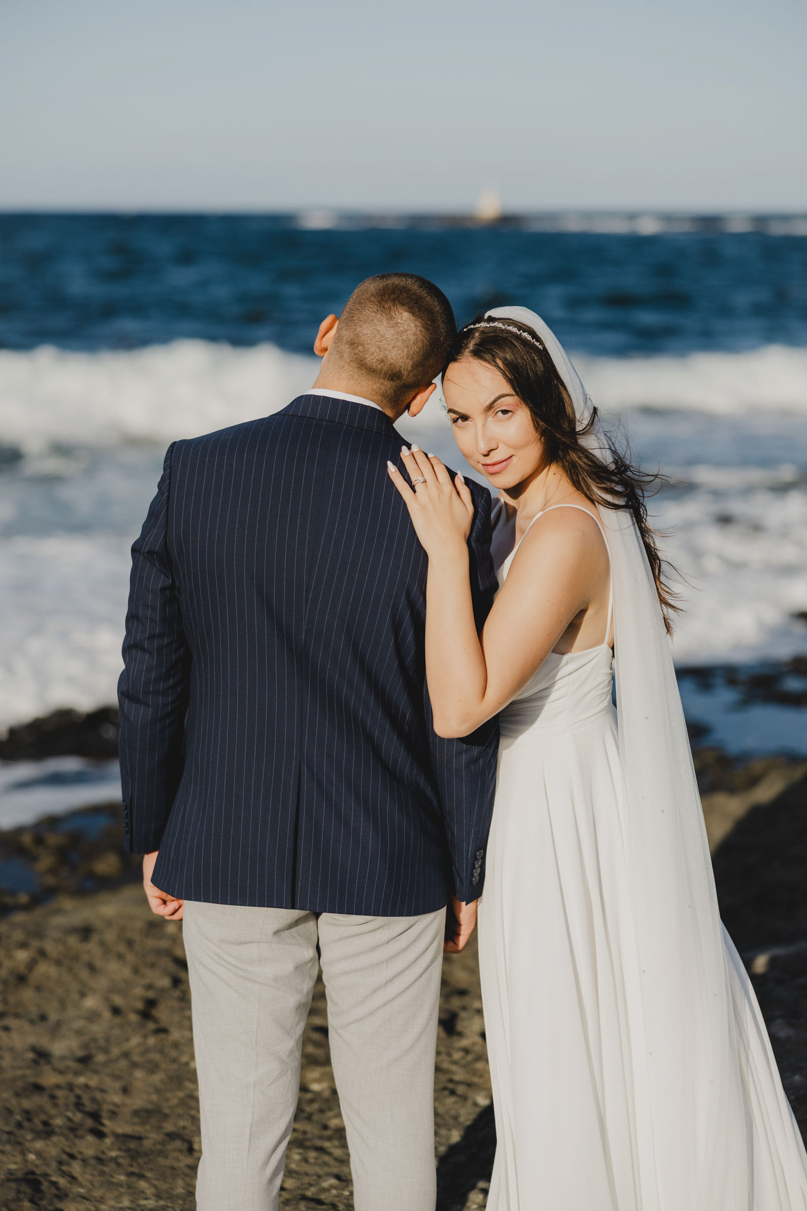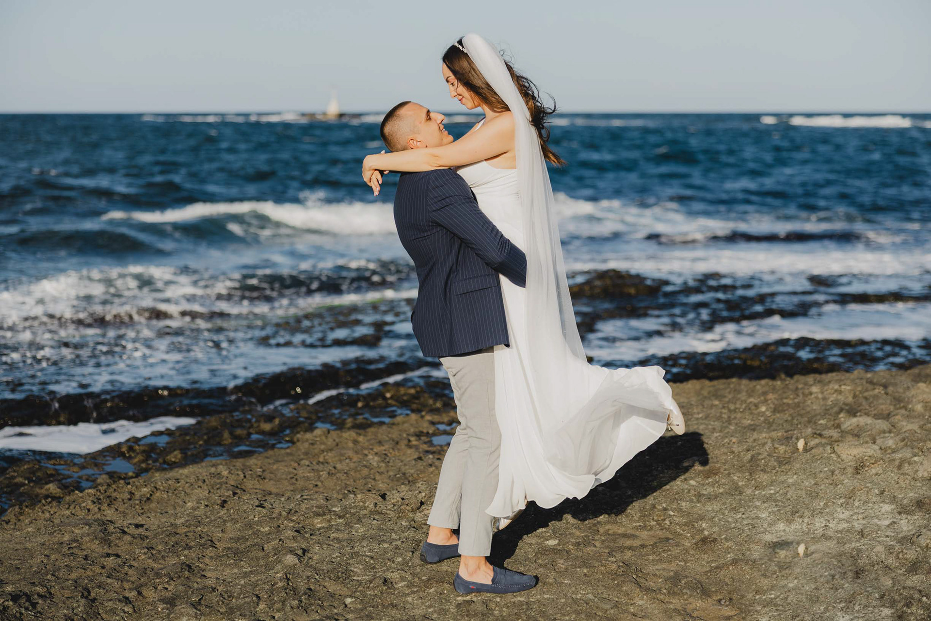 Вятър и море на скалите във Василико – един от най-красивите моменти от сватбената сесия в Царево