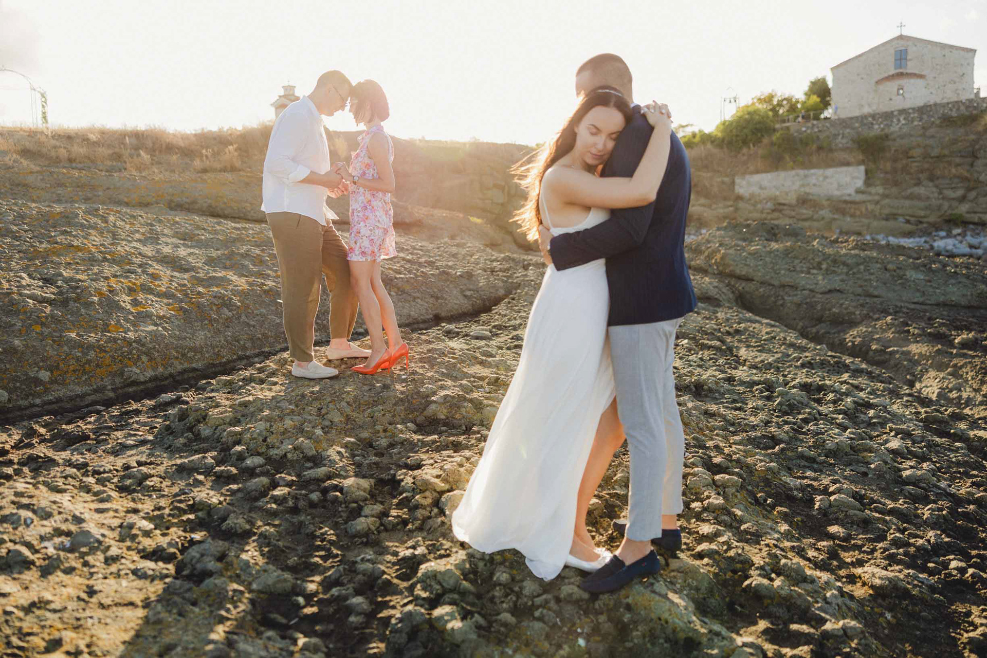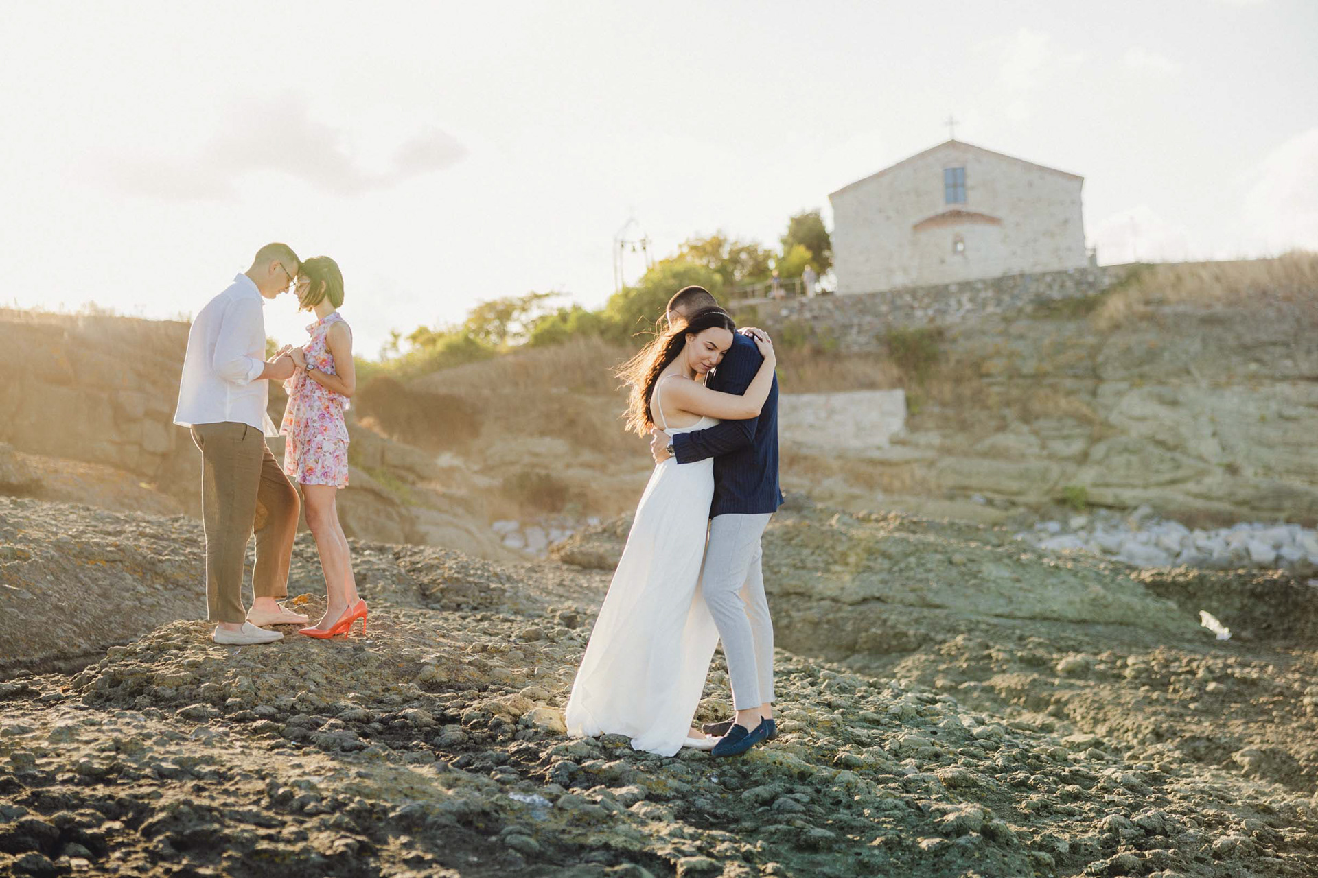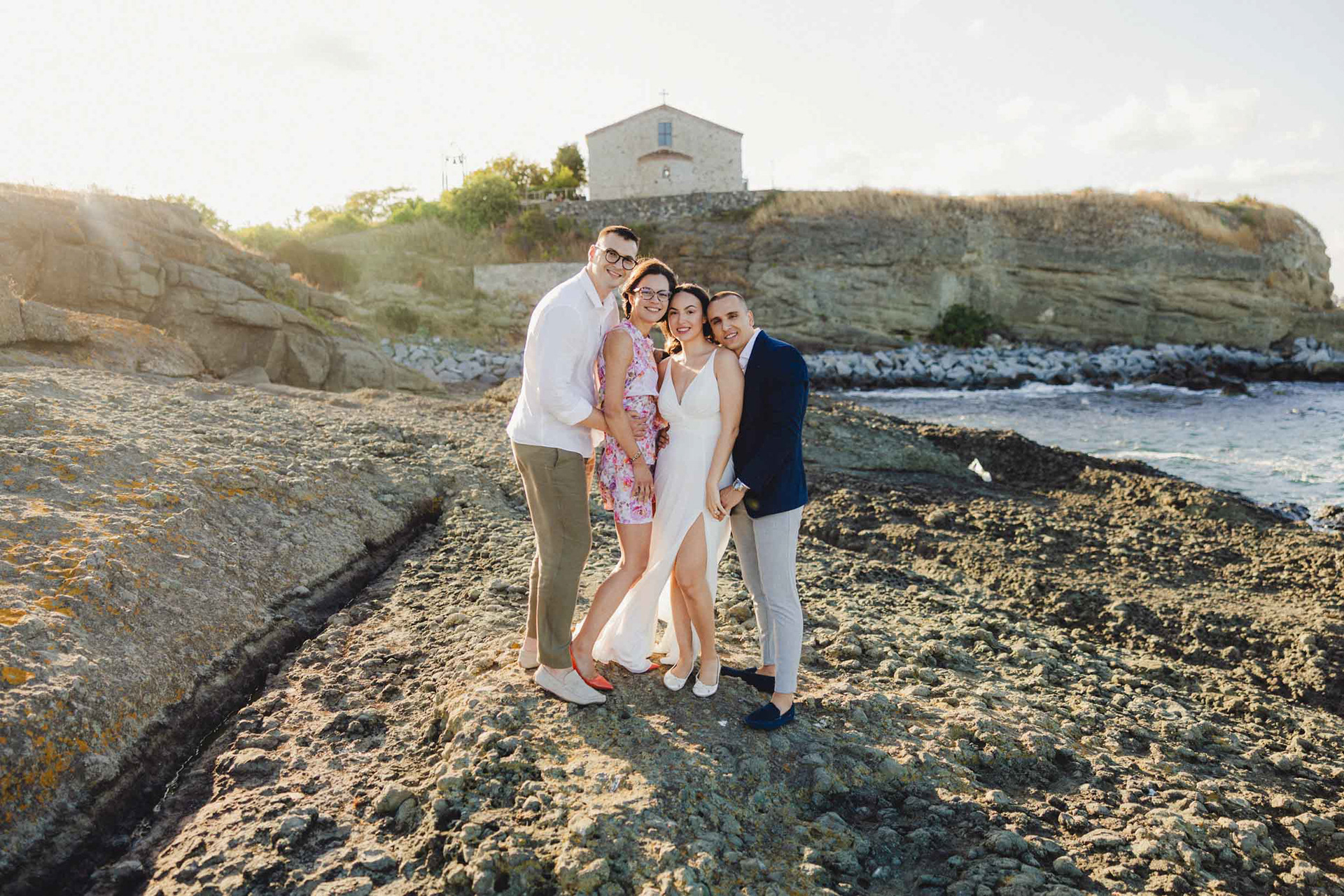 Кумове и младоженци в кратък танц на скалите в Царево, на фона на Храм "Свето Успение Богородично"