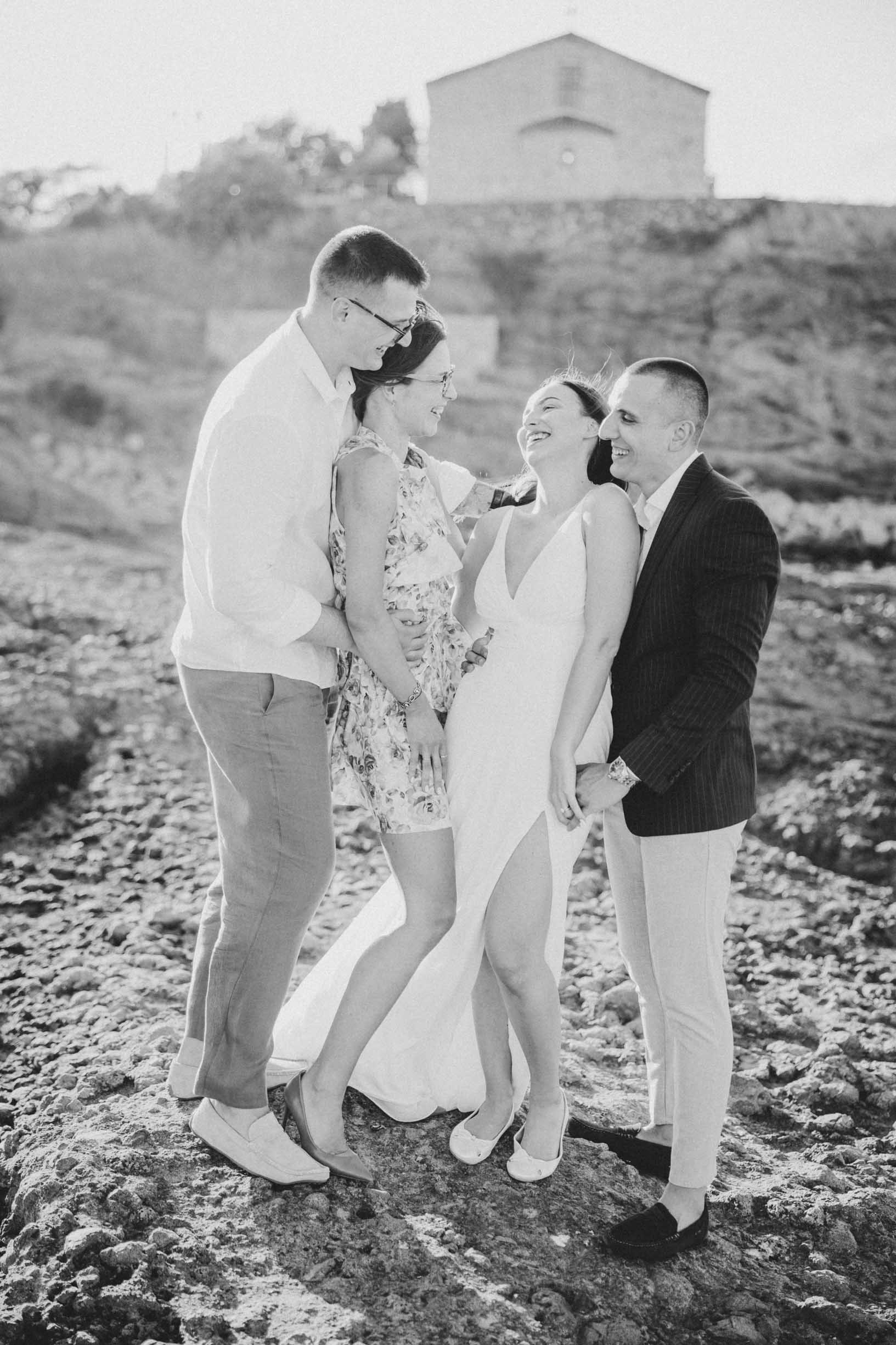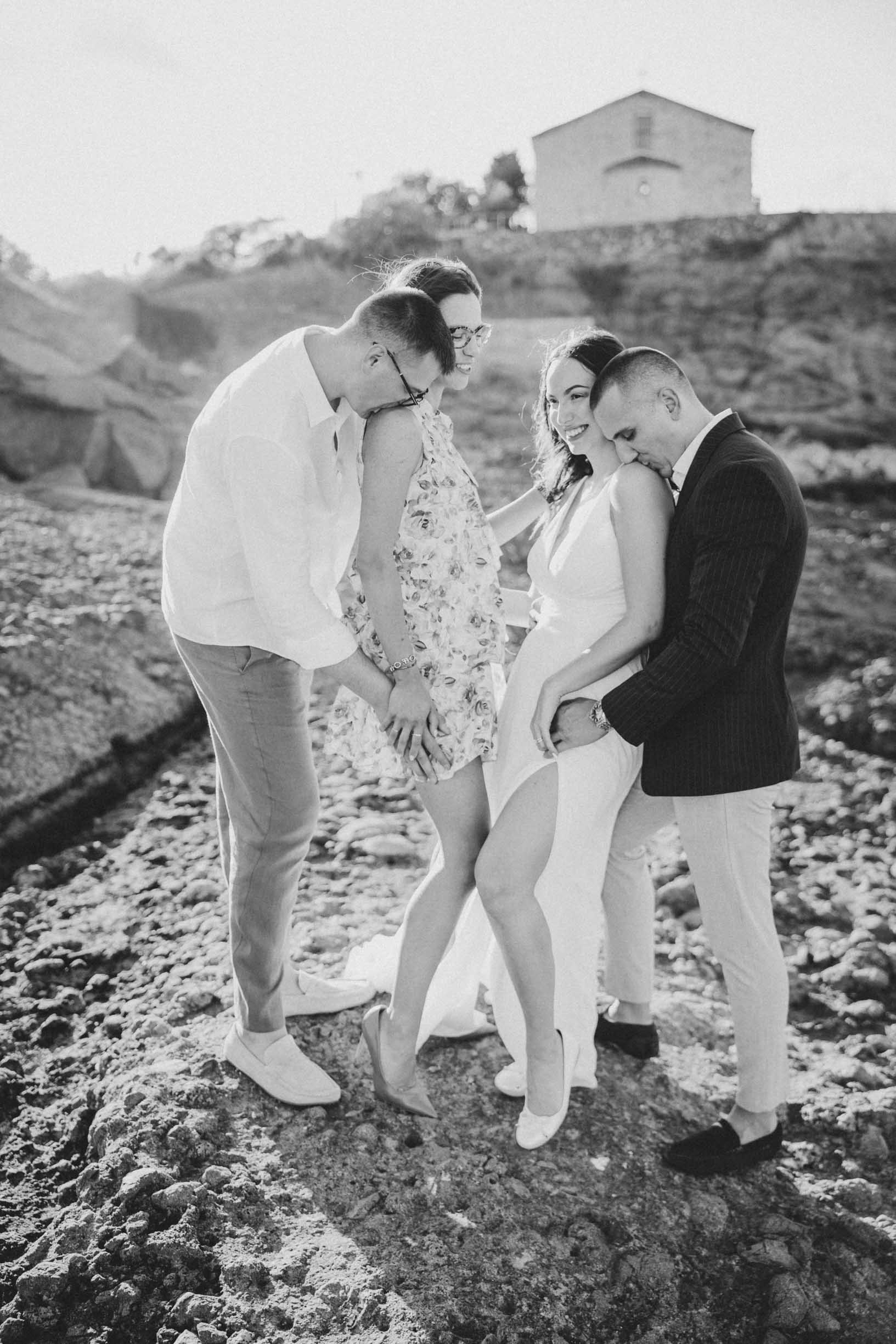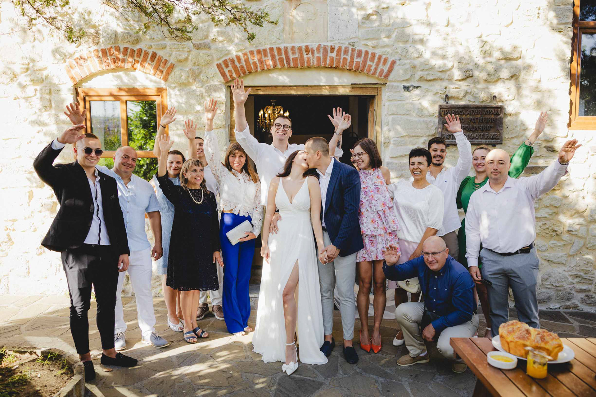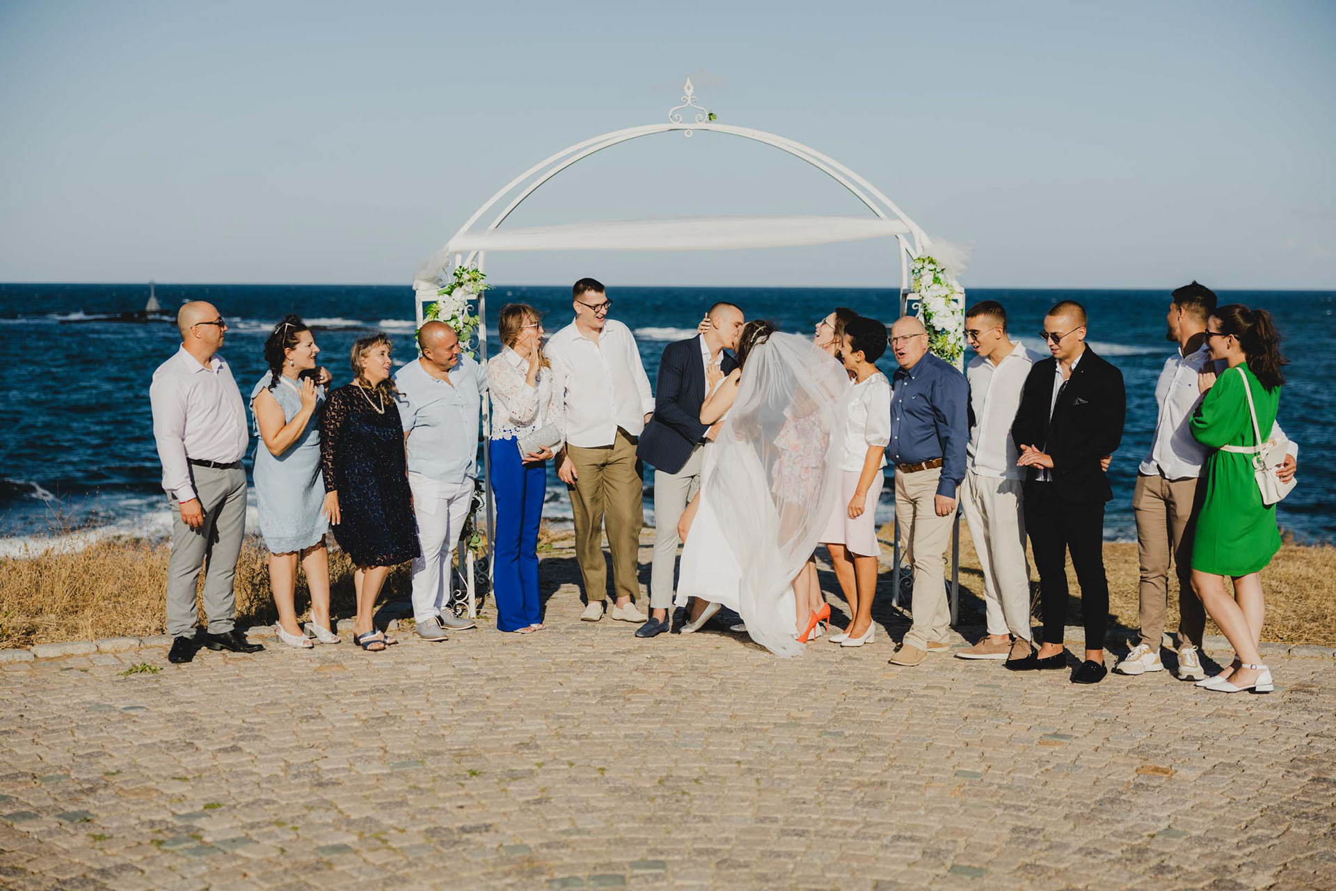 Кумове и младоженци в кратък танц на скалите в Царево, на фона на Храм "Свето Успение Богородично"